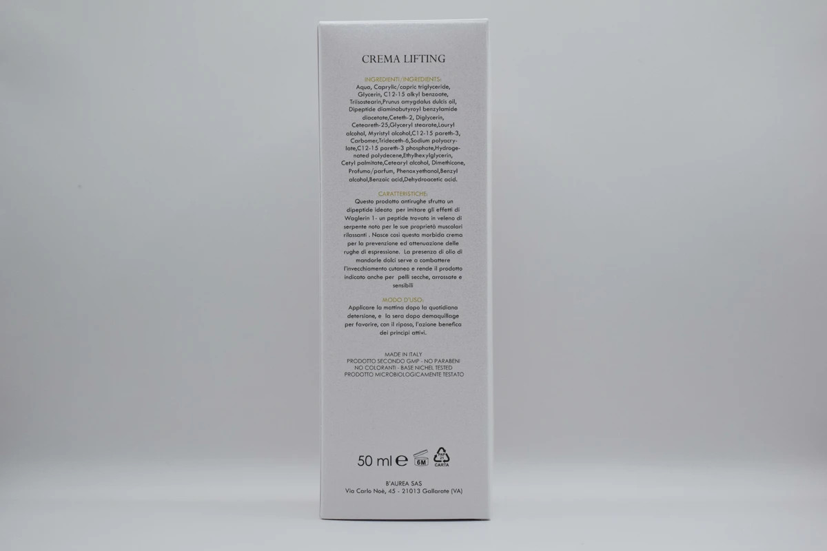 FEATURES: This anti-wrinkle product utilizes a dipeptide designed to mimic the effects of Waglerin-1, a peptide found in snake venom known for its muscle-relaxing properties. The result is a soft cream created for the prevention and reduction of expression lines. The presence of sweet almond oil helps fight skin aging and makes the product suitable even for dry, reddened, and sensitive skin.